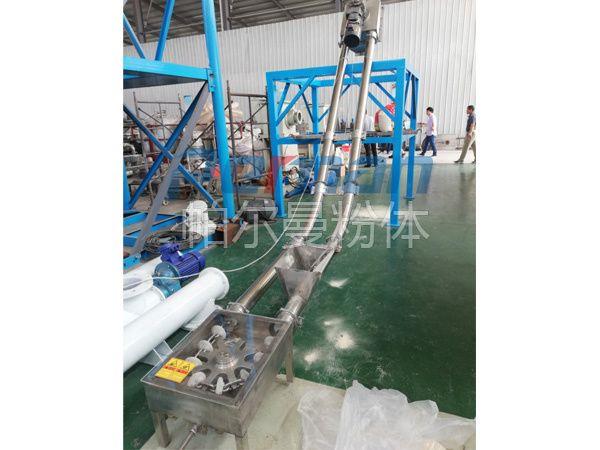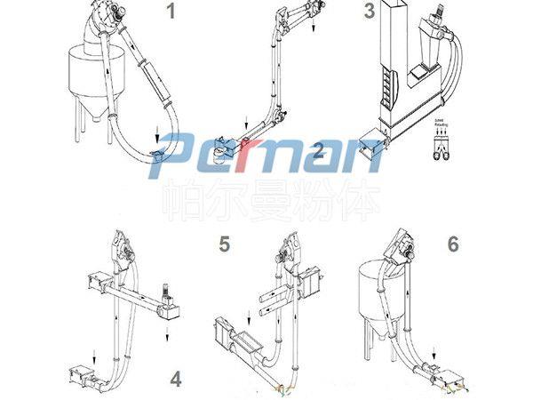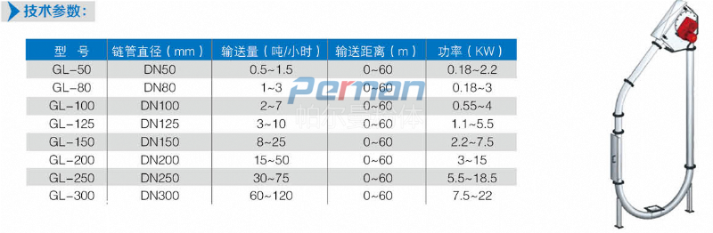 在密閉管道內,以鏈片為傳動構件帶動物料沿管道運動。當水平輸送時,物料顆粒受到鏈片在運動方向的推力,就隨鏈片向前運動,形成穩定的料流;當垂直輸送時,管內物料顆粒受鏈片連續向上的推力,阻止了物料下滑,并產生了橫向側壓力,增強了物料的內摩擦力,當物料間的內摩擦力大于物料與管內壁外摩擦力及物料自重時,物料就隨鏈片向上移動,形成連續料流。粉體物料可在三維空間內沿封閉管道直線移動或改變方向;水平輸送距離可達60米,垂直輸送距離可達到30米。