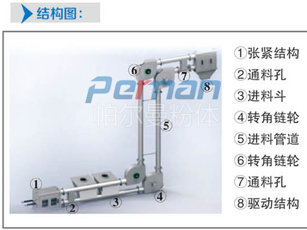 管鏈輸送機是輸送粉狀、小顆粒狀及小塊狀等散狀物料的連續輸送設備,可以水平、傾斜和垂直組合輸送。在密閉管道內,以鏈片為傳動構件帶動物料沿管道運動。當水平輸送時,物料顆粒受到鏈片在運動方向的推力。當料層間的內摩擦力大于物料與管壁的外摩擦力時,物料就隨鏈片向前運動,形成穩定的料流;當垂直輸送時,管內物料顆粒受鏈片向上推力,因為下部給料阻止上部物料下滑,產生了橫向側壓力,所以增強了物料的內摩擦力,當物料間的內摩擦力大于物料與管內壁外摩擦力及物料自重時,物料就隨鏈片向上輸送,形成連續料流。粉體物料可在三維空間內沿封閉管道直線移動或改變方向;水平輸送距離可達60米,垂直輸送距離可達到30米。